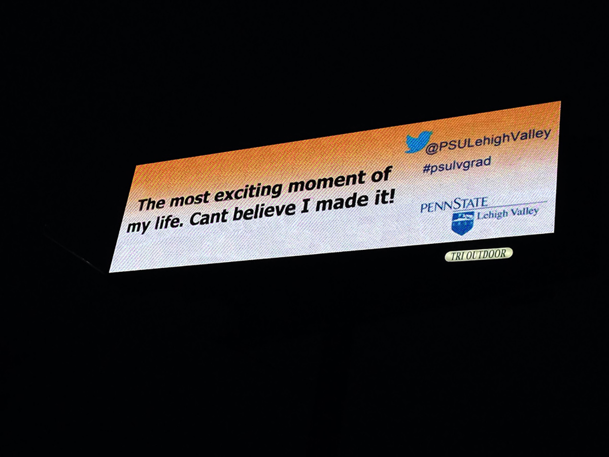 Tri Outdoor’s Sales Director and Partner Jason Wilson, collaborated with Penn State Lehigh Valley for the award winning “Onsite Tweet Penn State” campaign, which prominently featured a clean and legible design with live Twitter and Instagram posts during the campus’ May 2014 Commencement Ceremony, highlighting photos and tweets submitted by graduates, friends and family. The overall campaign began in advance of commencement with a branding initiative for the Lehigh Valley campus, followed by a countdown to the commencement ceremony and use of live social media before and during the event.